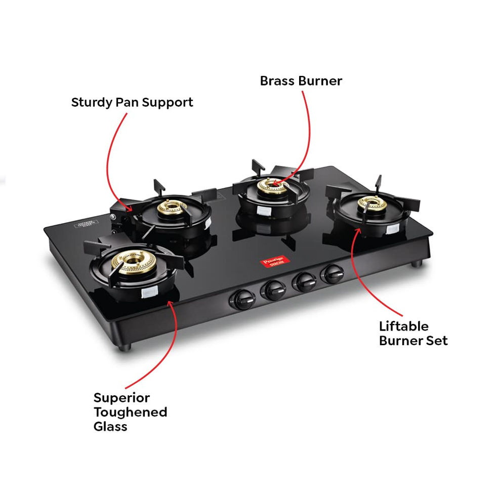 Liftable Burner Set-4 Burners Brass Burners Sturdy Pan Support Superior Toughened Glass 2 Years Warranty On The Product Made in india Color-Black: Ignition Type-Manual